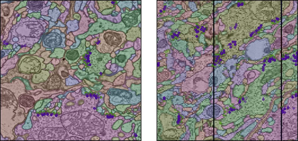 Annotations for pre- and post-synaptic partner pairs are provided as well. All locations are given as (z,y,x) in nm. In the padded versions of the datasets, the raw volume provides much more context. In this case, the annotation group has an additional offset attribute (z,y,x) in nm, which is the same as for the label volumes. All locations are relative to this offset, such that they are the same as in the unpadded version.